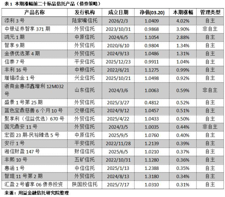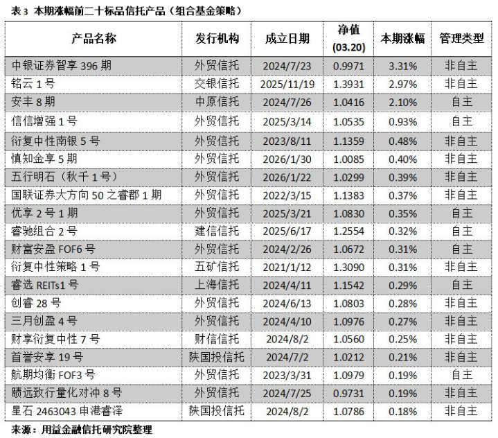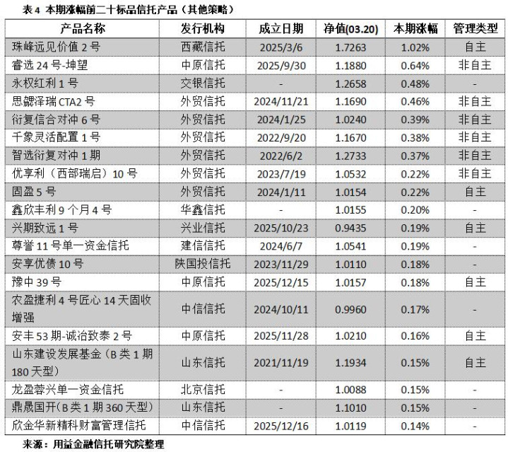 对本期(2026.03.14-2026.03.20)浮现净值数据的标品相信家具进行统计汇总,按照债券战略、股票战略、组合基金战略和其他战略等四大投资战略进行分类,并对各投资战略的家具时分收益率进行排行: