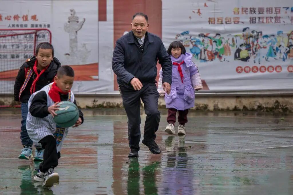 农加贵(右二)在落松地小学和孩子们沿途玩耍。2017年,他被授予世界谈德表率荣誉称呼;2024年,他当选世界教书育东谈主楷模。